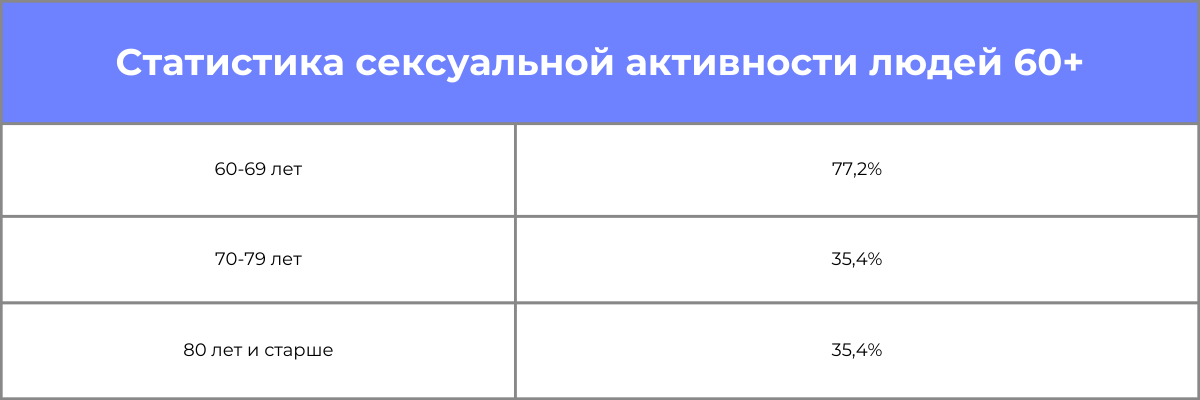Мода на молодость, или эйджизм – дискриминация по возрасту – повлияли даже на интимную сферу жизни современного человека. В обществе существует много мифов и запретов, которые мешают людям за 60 лет вести половую жизнь. Одно из убеждений связано с тем, что интимные отношения в старшем возрасте являются большой нагрузкой на сердце, поэтому представляют опасность для здоровья. В действительности врач может порекомендовать воздержаться на время от интимной близости, если сердечно-сосудистое заболевание находится в острой фазе, а симптомы не удается контролировать с помощью лекарств. Но даже после операции на сердце или сердечного приступа запрет на секс сохраняется всего несколько недель.