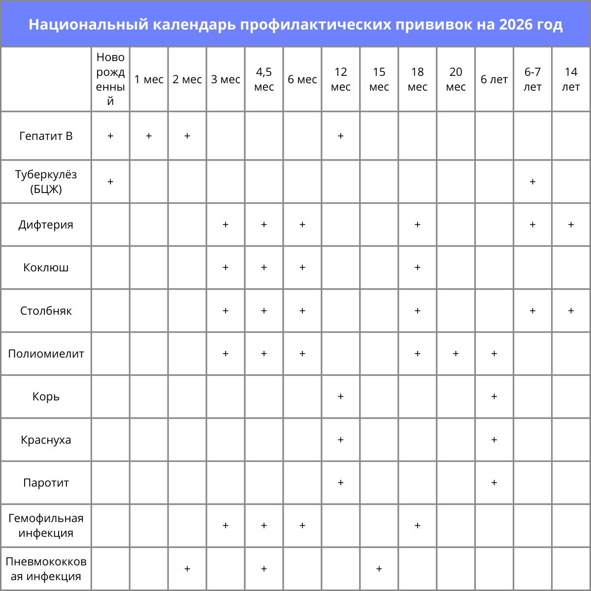 Согласно Национальному календарю профилактических прививок на 2026 год, утвержденному Минздравом РФ, дети получают вакцины против 12 инфекций. Все прививки бесплатны по ОМС и проводятся по графику от рождения до 17 лет.